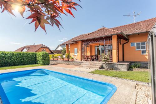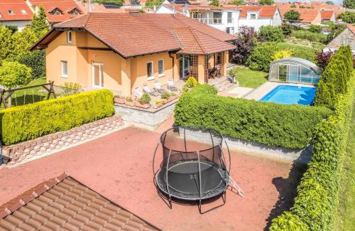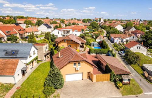 Offering a garden, Chalupa na vinařské stezce features accommodations in Starovičky. This property offers a private pool, free Wifi, and free private parking. The vacation home has a children's playground and a sauna. Featuring a terrace and mountain views, the spacious vacation home includes 5 bedrooms, 2 living rooms, flat-screen TV, an equipped kitchen, and 3 bathrooms with a bath and a shower. A private entrance leads guests into the vacation home, where they can enjoy some wine or champagne and fruit. There's also a seating area and a fireplace. For those times when you'd rather not eat out, you can cook on the barbecue. Sightseeing tours are available close by. The vacation home has a picnic area where you can spend the day outdoors. Lednice Chateau is 11 miles from the vacation home, while Chateau Valtice is 15 miles away. Brno-Turany Airport is 22 miles from the property, and the property offers a paid airport shuttle service.
