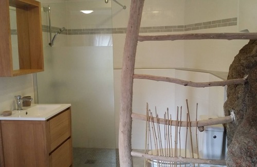 Pretty bedroom with bathroom (Italian shower) The bed is glued to the rock that we have preserved and on which floated a wooden partition separates the bedroom from the bathroom. A small kitchen is adjacent. For a surcharge you can be prepared a simple kitchen. Dining area on the terrace extends the kitchen. You will take breakfast if you wish. But generally those are taken on the terrace.