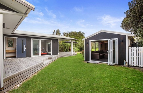 Changing Sands offers a heat pump and modern amenities such as Smart TV and Wi-Fi, ensuring you have a comfortable and connected stay. This spacious bach features three comfortable bedrooms, a cool second lounge with double sofa bed, and sleeps up to eight comfortably. The luxurious king bed and two double bunks ensures everyone can get a good night's sleep, also complemented by a modern main bathroom inside and right beside the funky second lounge.