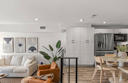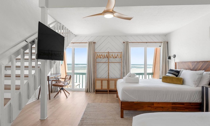 Luxurious midcentury modern beach home with stunning ocean views, breathtaking sunrises, and rare direct beach front access. Spanning 3 light-filled levels, it sleeps 8 in comfort with sleek design and premium details. Enjoy a fully-stocked kitchen, quality beach equipment, and kid-friendly gear. Floor-to-ceiling windows bring in natural light, creating a bright and airy retreat. Just a short drive to St. Augustine, it’s the perfect place to revitalize and re-energize for your coastal getaway.