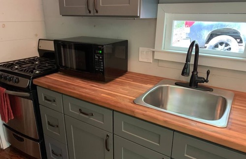 This tiny house is 1 of 3 that sit alongside of a creek that runs through the property. Remotely located you'll enjoy hearing the sounds of the water and birds chirping. This new tiny house features two smart TVs, air conditioniong/heat and and a fully equipped kitchen. If you are traveling with others you can rent Creekside Tiny Homes 1 and 2 and for very large groups at the main cabin, Suches Creekside, which sleeps 6. Located within a 10 min drive of Winifield Scott Park.