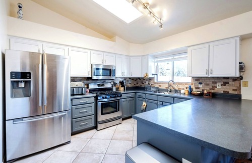 - Full-sized fridge, stove, oven, microwave, and dishwasher
