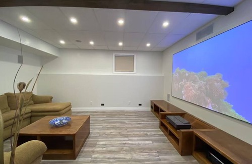 Enjoy a 7.1 surround sound home theater experience in the basement, featuring a modest laser projector and a 120-inch screen — perfect for movie nights or immersive viewing. This cozy, multi-purpose space also serves as a family/living room, making it the ideal spot to unwind, whether it's during the day or a quiet evening in.