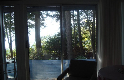 Another bedroom has its own bathroom and is located at the opposite end of the house from the master bedroom. It has sliding doors to the large lakefront deck. This room has bunk beds and can sleep 4 people. It is quiet and light. It has an additional art and drawing room attached which looks out over the nearby woods. The drawing room also has a washer and dryer.