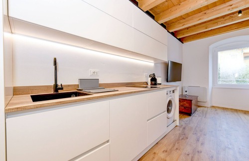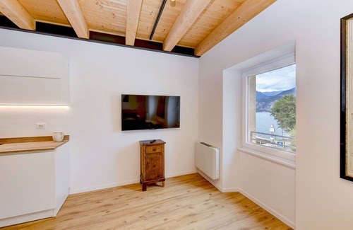 With a direct view of Lake Garda, in the heart of the picturesque Piazza San Nicolò in Assenza di Brenzone, the L'Isola flat is located on the first floor of a completely renovated building on the lakefront, in a privileged location for those who want to experience a quality stay surrounded by elegance, tranquillity and views.This spacious and bright accommodation welcomes guests in a modern and comfortable environment that offers a relaxing living experience in all seasons. The living area is spacious and characterised by large openings that flood the room with natural light. It consists of a comfortable living room with sofa bed and flat-screen TV, as well as a fully equipped open-plan kitchen with induction hob, fridge-freezer, dishwasher, kettle, coffee machine and washing machine.The sleeping area comprises two elegant double bedrooms, both cosy and stylishly furnished, with access to a lovely private balcony with mountain views, adding a touch of romance and tranquillity.There are two modern bathrooms, both equipped with a shower, hairdryer and all the necessary amenities for daily life. The presence of two bathrooms makes the flat particularly practical for families or small groups.The entire flat is fully air-conditioned, has free Wi-Fi and offers the possibility of using a car park, which is located in the immediate vicinity and is within easy walking distance.The lakeside location is not only attractive, but also strategic: right in front of the building is the landing stage for boat trips, so you can explore the lake even without a car.The building houses four independent flats, making it the ideal choice for groups of friends or several families who want to spend a holiday together. Everyone can enjoy the same lakeside location, share moments of leisure and conviviality while maintaining their intimacy and privacy thanks to the separate layout of the rooms.Assenza di Brenzone, with its authentic and relaxed atmosphere, is a small lakeside village that has retained its old-world charm. It is home to a variety of bars, restaurants and beach clubs, all within a few minutes' walk. It is the perfect destination for anyone looking for a relaxing stay close to the lake, surrounded by nature, flavour and simplicity.