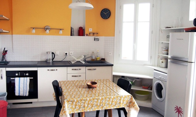 Prepare a home-cooked meal in the kitchen, complete with an oven, a stovetop, and a refrigerator, as well as a coffee maker, an electric kettle, and cookware. Bathroom amenities include a hair dryer, towels, and toilet paper. And you won't have to pack extra clothes, because you'll also have a washing machine. Other amenities include bed sheets, an ironing board, air conditioning, and a dining table.