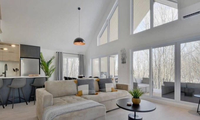 Its impressive cathedral ceiling, inviting mezzanine, and large windows flooding the space with natural light create a soothing, minimalist, and contemporary atmosphere. The furnished terrace offers a stunning view of the surrounding forest — perfect for enjoying your morning coffee or sharing a relaxing moment together.