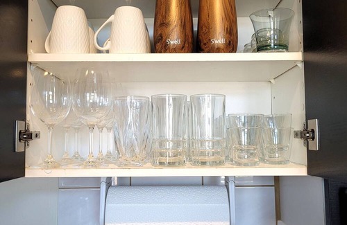 The bathroom has a full sized tub with massage shower and large mirror vanity.The kitchen is fully equipped, with a fridge, stove, washer, dryer and many small appliances including a Saeco bean-to-cup espresso machine, toaster oven, microwave, kettle, popcorn maker, air fryer, coffee grinder, etc. A window AC, portable oscillating fan, dishes, cups, cutlery, utensils, pots & pans, baking trays, extra linens, vacuum cleaner, etc. are all provided to make you feel even more at home during your extended stay.
