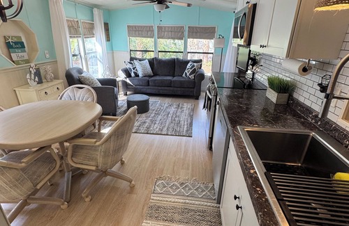 This memorable cozy park model home is the perfect home base for your trip to Sarasota. Nestled in a tranquil setting, this cozy retreat features 1 bedroom with a queen bed, a large lanai with AC containing a twin over full bunk bed, and a bathroom with a hair dryer. The living room also has brand new queen sofa sleeper. Guests can enjoy the soothing ambiance in the large heated pool, WiFi, AC, and more. You're sure to make fantastic memories with a stay at our place.