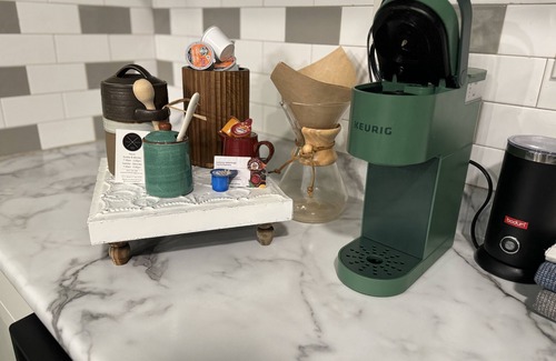 Enjoy coffee and breakfast in the eat-in kitchen, completely stocked with a coffee bar, blender, and toaster.