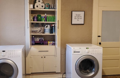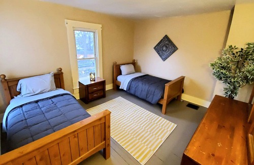This historic home has a wrap around porch, a sizable back yard, and a queen master bed. The second bedroom has 2 twin beds, and there is a fold-out couch located in the living room. Washer and Dryer, coffee maker, spacious desk, smart TVs, fridge, oven, linens and houseware items are provided.