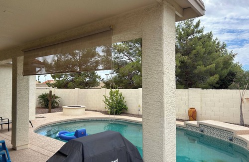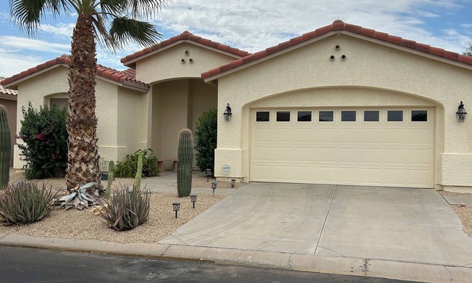 Discover the beauty of Sun Lakes from this charming 2-bedroom house. With a king bed and a queen bed, guests can relax in style. Enjoy the cool living room with a comfy sofa bed for extra space and a full kitchen with dining table. This fabulous property also offers amenities like heated pool, gas fire pit, AC, WiFi, tv in each room and a washer and dryer. We hope you'll enjoy your stay at our house!