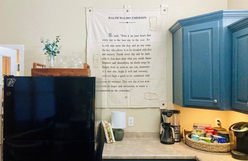 Welcome! This lovely two bed two bath home has all the essentials for comfortable living! Enjoy the ample parking, eat-in kitchen, dedicated office, dining, family and laundry rooms, which make the stay perfect for both quiet retreating or cozy gathering. Eclectic styling, attention to detail, and unique artwork bring warmth and interest to each space. Amenities include free WiFi, smart TV, keyless entry, central AC and heat. The primary bedroom has a queen bed and attached full bath. The secondary bedroom has a full bed and direct access to the full hall bath.