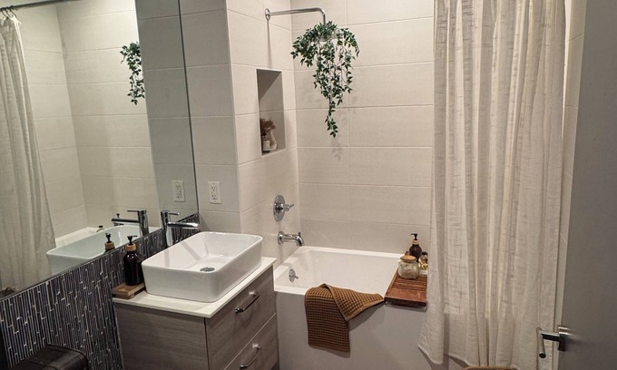 Make yourself at home in this 2-bedroom New York retreat. This apartment offers a soothing atmosphere with 1 queen bed, AC, WiFi, and access to a fitness room. Enjoy the serene surroundings and convenient amenities during your stay. We look forward to hosting you at our place.