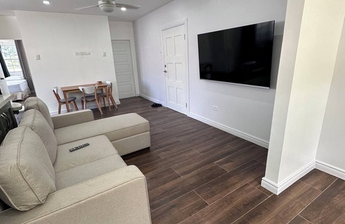 Open plan kitchen, dining and living, modern interior with all amenities for your comfort including a coffee-press, blender & toaster along with complimentary tea, coffee and water. Also available is an iron, blow dryer and washer/ dryer facilities. Apartment is sanitized between bookings
