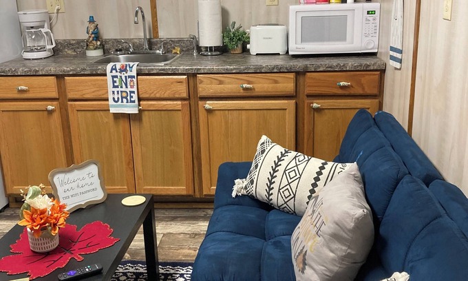 This cozy 2-bedroom retreat features 1 queen bed, 1 full bed, 1 bunk bed, and 1 twin bed, perfect for families or friends. Unwind in the living room with a comfy futon after a day of exploring. 42 inch smart tv, coffee pot, toaster, microwave, electric skillet, crock pot, dishes, silverware, grilling utensils. Outdoor propane grill, with a picnic table.