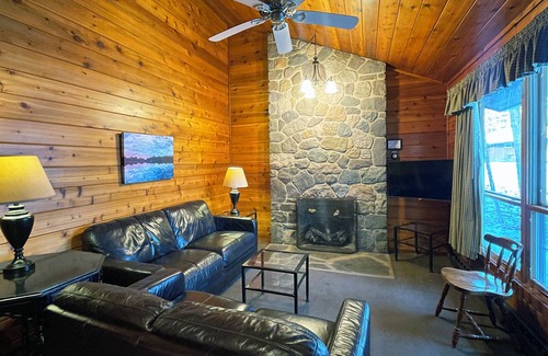 This charming cedar cottage is tucked in a circle of towering hemlock and white pine. Your cabin has a lovely stone fireplace (gas fireplace, no wood needed), handsome vaulted ceilings and a covered porch for relaxing outdoors. With its wonderful view of the lake, this cottage is a beautiful and tranquil retreat.