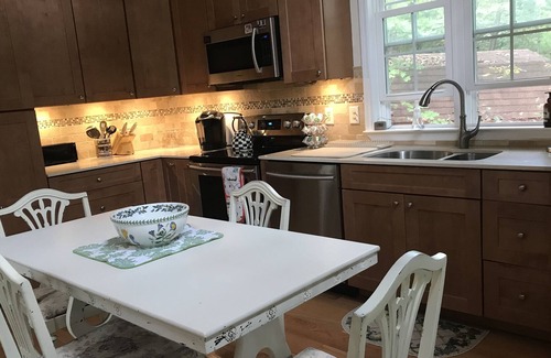 Quaint, comfortable newly updated two bedroom one and a half bath cabin nestled in the woods with all new amenities, including fully equipped kitchen with