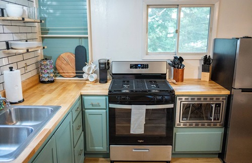 Inside, enjoy modern amenities like a gas stove, microwave, Keurig, smart TV, AC, and Wi-Fi. The cozy 2BR/1BA layout includes a spacious bathroom, a full bed, and two twin beds, plus an enclosed sunroom perfect for morning coffee or evening unwinding.