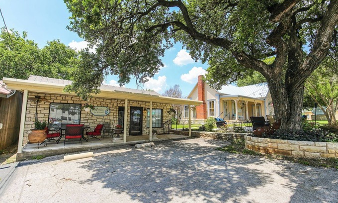 Location, location! 2-bedroom cottage on historic Main St. This nice property features 1 king bed, 1 queen bed, 1 bunk bed, 3 sofa beds, 2 pull-outs with 2 full bathrooms. Perfect for a group getaway. Enjoy easy access to boating/lake activities, shopping, cafes, live music, cavern tours, year-round events or relax on the porch in the heart of the Texas Hill Country in Marble Falls. Just steps to shopping and restaurants.