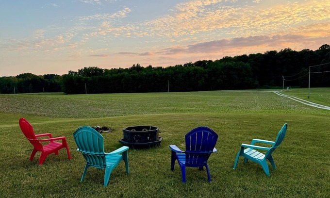 Pineridge is waiting for you at this charming 2-bedroom house. Step inside to find a welcoming space with 1 king bed and 1 queen bed. This enchanting property also features a cozy living room with a sofa bed for extra guests. Kickback, relax, and enjoy everything La Porte and our house has to offer. Located on 70 acres of beautiful rolling prairie and farmland. Very private and secluded as the driveway is nearly 3/4 mile long. Master suite has a King bed, a garden tub for relaxation and a shower. Second bedroom has queen bed and tub with shower. Laundry room is also available with another 1/2 bath. Beautiful outdoor deck overlooking rolling hills with a comfortable pit group to relax on and a Weber grill for cooking your favorites. Deer, wild turkey, and wildlife are everywhere you look. The outdoor firepit is a perfect place to relax and stargaze at night. Located 5 minutes from Three Oaks, MI and 15 minutes from beautiful New Buffalo, MI. Wine Country is a beautiful 25 minute drive.