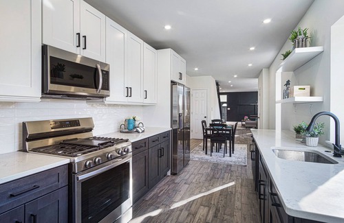 This Wilmington house boasts 2 inviting bedrooms with 1 queen bed and 1 full bed. The home boasts an open floor plan, high 9ceilings, real hardwood floors, exposed brick, custom interior and exterior elements, curated luxurious tiles and high-end finishes throughout. The first floor offers an enclosed porch flooded with natural light. The living room draws attention to both a custom-built steel railing and cut out niche to house a brand new 55'' smart tv. The galley kitchen is fully equipped with granite countertops, 42'' wall cabinets and under cabinet lighting for convenience & ambiance. All appliances are new Samsung stainless steel. The stove features a built-in air fryer. This level includes a powder room for guests as well. Off the kitchen is the backyard perfect for a garden, relaxing or small gatherings.