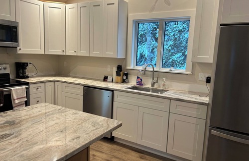 Brand new 2 bedroom home on 10 acres of beautiful wooded land. 5 beds (2 twin bunks, 1 king, 1 queen) 2 bath, granite countertops island /kitchen, 1 60” flat screen, Wi-Fi, free YouTube TV- 100+ channels, Verizon wireless cell booster, hardwood floors. wood in woodshed for the fire pit/fireplace. Less than 10 mins to Okemo/Jackson Gore, & Ludlow. 5 miles to Lake Nivyah, Magic Mt 18mile 30 min to Killington/Manchester Outlets, Located opposite mtn traffic for easy in & out This Mount Holly house boasts 2 inviting bedrooms with 1 king bed, 1 queen bed, and 1 bunk bed. The cozy atmosphere and charming decor make it a perfect retreat for guests looking to unwind and relax. With amenities like WiFi, a washer/Deyer, dishwasher disposal , your stay will be as comfortable as can be. We hope you'll enjoy your stay at our enchanting house.