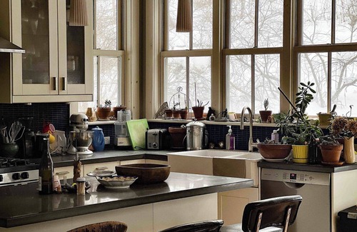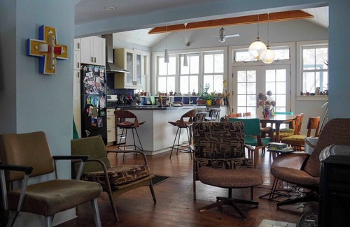 The house has a full bathroom with a tub upstairs and a half bath downstairs. There are 2 bedrooms upstairs and a comfortable daybed in the cactus room – can easily sleep 5. There’s an outdoor shower for warmer months. We would love to host people who can appreciate cute plants and quirky decor.