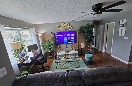 Discover this fabulous 2-bedroom gem in Palm Bay. This awesome space is located within a home (not the entire home) that features a designated private area, which includes one room with a queen-sized bed, a second room with a full-size bed, a bathroom, a Living Room with a desk, and a dining room for guests to enjoy (no kitchen). Enjoy the homely amenities like microwave, small fridge, iron, hair dryer, AC, heating, and WiFi, perfect for a warm stay. Feel free to reach out to us during your stay - we're happy to suggest local spots to check out.