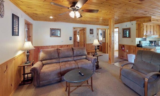 Charming 2-bedroom private with AC, WiFi, hot tub, fire pit, pool table, grill | Cabin in Gaines