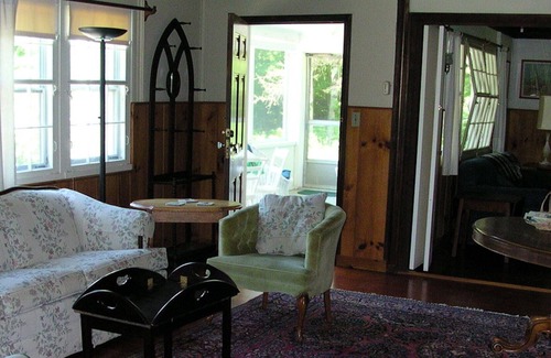 High Acres Cottage is a 2-bedroom 1930s era summer home in Strafford, Vermont. The Cottage is a located in a pretty, quiet, country setting with large lawns, a swimming pond, and walking trails. It is adjacent to the Clover Hill Wildlife Preserve. The facilities include a full kitchen, laundry room, large living room with dining area and fireplace, a den (with convertible sofa), two bedrooms (one twin & one queen), 2 full bathrooms, a screen porch, and a stone terrace that overlooks the pond. Satellite TV and Wi-Fi are included. The cottage is located in Strafford, Vermont, 5 minutes from exit 2 on Interstate 89, 20 minutes from Hanover, NH and 15 minutes from Quechee, VT and the Vermont Law School. One dog is negotiable with pet deposit.