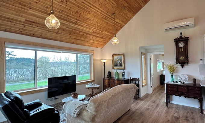 This new 2 beds and 2 baths house, sitting on 2 aces + flat grass land and 16 fruits tree of hundred years old, facing to a peaceful and beautiful beach (approx 500 feet from beach), located in wildbey island of Puget Sound area, with sufficient light into rooms and beautiful view of beach and mountains from all windows and surrounded by birds singing and deers strolling. Easy access to Deception Pass park , Burlington, Birmingham, La Conner which are rich in natural sceneries and full of history. Tesla charging is available and fee is required $40/night