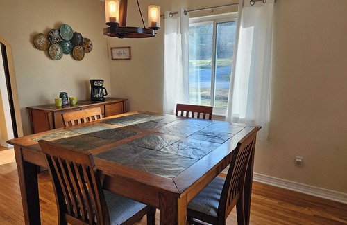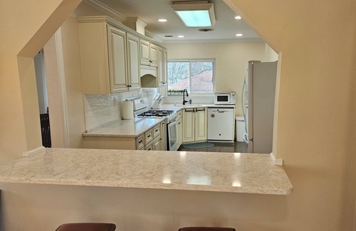 Full kitchen with essentials, coffee bar with brand-new 12-cup drip coffee maker, and dining room table to seat 4.