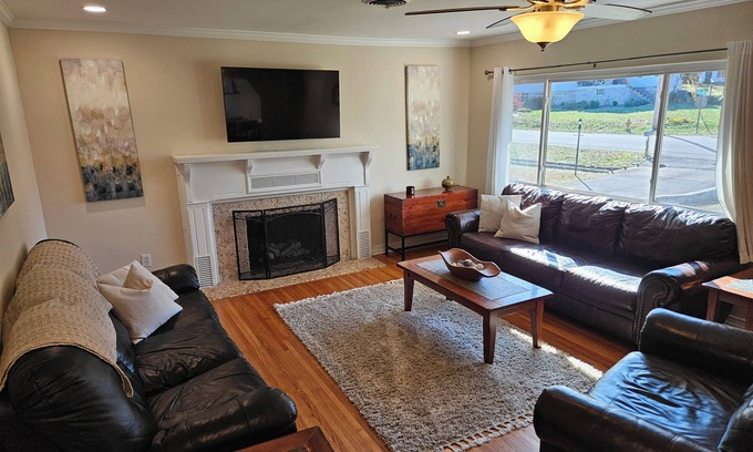 Cozy living room with two leather couches, large chair and ottoman, coffee table, gas fireplace, and 55 inch Samsung smart TV.