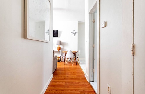 Kick back in the cozy living room featuring a Smart TV (logged in to Netflix, Disney+, Hulu, and more) and a comfy sofa perfect for unwinding after a day in the city. The décor is light and inviting, with a New York City-themed wallpaper accent that adds character (a great backdrop for group photos!). We’ve provided a few board games and books for your entertainment as well.