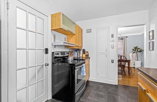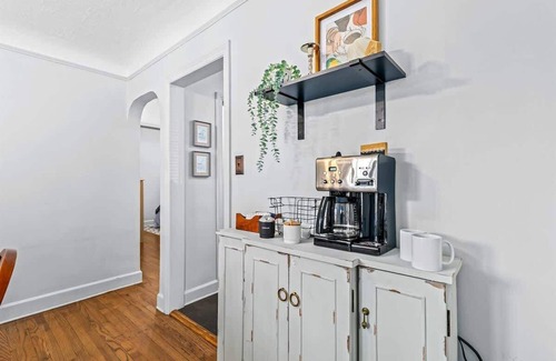 As soon as you enter the charming flat, you'll enter the newly renovated kitchen. The Kitchen is stocked with all the essentials to cook your favorite meals at home. It is designed and furnished with numerous modern and comfortable amenities, while maintaining the original charm of the 1920s built home, that complement the fantastic Royal Oak location.