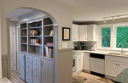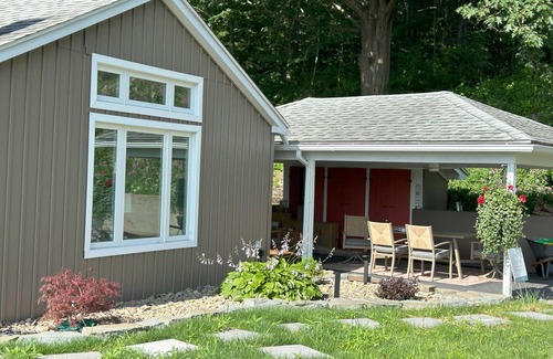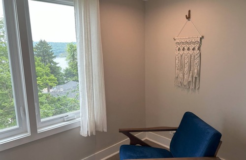 Overlooking Beautiful Keuka Lake, our newly renovated guest house features 3 bedrooms, 2 bathrooms, great room with gas fireplace, music room with piano, and first floor office/nursery. Decorated with a breezy mid-century vibe, all rooms boast spectacular lake and woodland views!