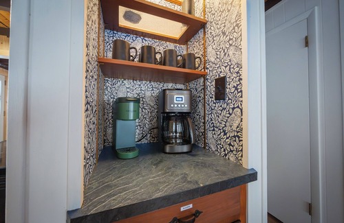 The entry-way has a large coat closet and shoe area. We ask that you please remove shoes while you’re in the house. The dedicated workspace is off to the left where you’ll find a large desk with lots of natural light. To the right, you'll find the fully stocked kitchen that has everything you need to prepare meals and is open to the dining area, with two extra seats at the counter.