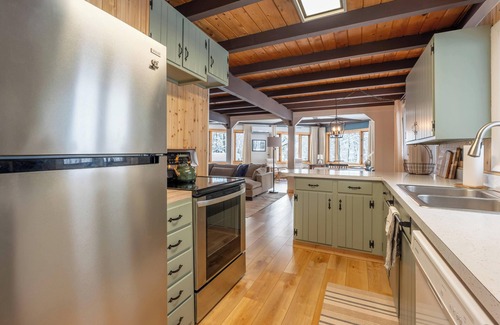 The open-concept living area has a large comfy sectional couch where you can relax by the wood stove and cozy up for a movie night on the 55” TV, or enjoy a family game night with one of the board games stocked in the TV cabinet.