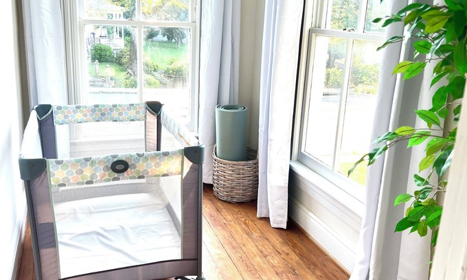 Upstairs, discover a tranquil retreat housing 3 bedrooms, each with blackout curtains, plush mattresses, and an array of pillow options from soft to firm. Sleeping arrangements include a total of 5 beds - King Bed, Queen Bed, Twin Trundle Beds, and a Foldable Twin Bed. The bedroom with the queen bed includes an en-suite half bathroom. The second upstairs bathroom boasts modern touches and is generously stocked with amenities such as shampoo, conditioner, lotion, eucalyptus shower spray, and a hairdryer, ensuring your comfort throughout your stay. Upstairs also offers a flex room that can be used as a nursery with blackout curtains and an included travel crib or a peaceful yoga sanctuary.