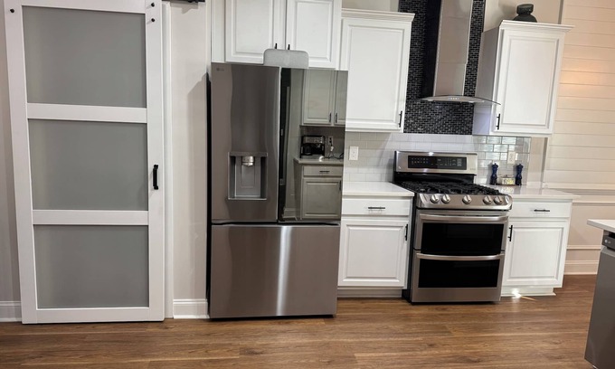 Your Lithia Springs adventure begins at this welcoming 3-bedroom modern enchanting bungalow. Step inside and discover a cozy haven with well equipped kitchen perfect for preparing fresh meals and a spacious living room with a remote-controlled fireplace. Unplug and unwind in this idyllic setting, where you can truly relax. This property has a private-fenced backyard with a charming patio, charcoal grill and a jacuzzi. Enjoy working at a private workstation. Just ten minutes away from Six Flags Over Georgia. Inside, guests will find 1 queen bed, 1 king bed, 1 futon, perfect for a cozy stay. With amenities like free WI-Fi. We look forward to welcoming you to our place.