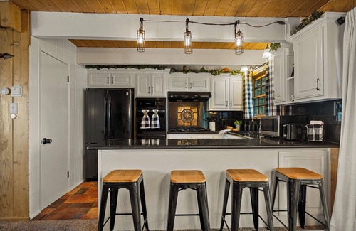 This charming retreat features a flat entrance with a horseshoe driveway. Step into our open-concept living area, complete with a gas fireplace and a beautiful farmhouse table. Lose yourself in one of our carefully selected novels in the intimate reading nook. Enjoy a cup of Peet's coffee, freshly squeezed lemonade, or a glass of wine on the tranquil deck, which boasts a picturesque fire pit and a peek-a-boo lake view. Spend quality time relaxing in the hammock under the trees, enjoying the peaceful surroundings during sunrise and sunset. The spacious deck overlooks a private, fully fenced backyard, perfect for your family, friends, and fur babies. This cabin is a perfectly peaceful getaway, blending elegant rustic charm with the breathtaking beauty of the Lake Arrowhead mountains.