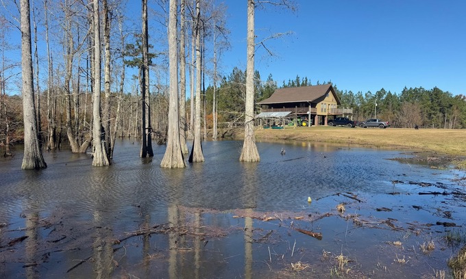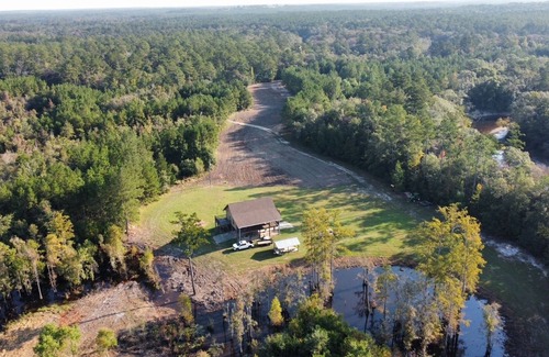 This gorgeous property is extremely unique and located close to the Mobile/Lucedale Ms line. This property is rural and sits on 130 acres. The cabin has great access to your own private sand bar on the escatawpa river where you can fish, swim, and relax. This cabin has two private bedrooms and one open loft bedroom. Upstairs has two queen beds and a full. The main floor has two bedrooms, one has a king size bed and the other a queen. This is a fishing/hunting retreat but set up very nice. Its very comfortable. Its EXTREMELY private. You will see deer, turkey, and ducks. The river and pond both have bass bream and catfish. Bring your own fishing rods and tackle. There is a bait shop not far away. The cabin over looks an extremely gorgeous pond with standing cypress trees. The river sand bar is easy to access by foot, or you can drive down to it and walk an easy sand path to the sand bar. Shopping is within 15 mins in Lucedale where you will find great restaurants and shopping near by. Bring your golf carts, kayaks, tubes, and sunscreen. The camp will have plenty of linens and towels. The camp has a stove, dishwasher, and refrigerator. There are plenty of pots and pans and utensils for cooking. There is no washer and dryer so make sure you come prepared. The private drive is rocky/muddy. Easy to navigate with any vehicle but can be bumpy and can get a little muddy if it rains. Its about a mile private drive down to the camp. This isn't a HOLIDAY INN, lol. Its a cabin in the woods. Embrace it. Love it. It won't be perfect, but you'll make memories you'll never forget, see sunsets you'll always remember, and most likely book to come back! There is high speed fiber optic cable here, so you can stream your devices and shows. There are multiple flat screen tv's. Only one full bathroom is upstairs.