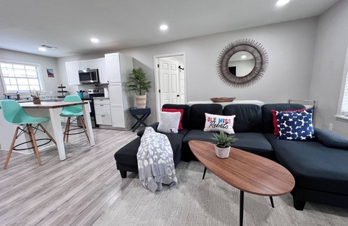 Welcome to Rebel Retreat! Just minutes from Ole Miss, this charming home features a cozy front porch with rocking chairs, a master suite with a plush king-size bed, and spacious closets. The open-concept living area flows into a fully stocked kitchen, perfect for meals with friends or family. Enjoy the convenience of being near campus and Oxford’s historic Square, while relaxing in this peaceful, comfortable setting. Book today to experience true Southern charm and modern comfort!