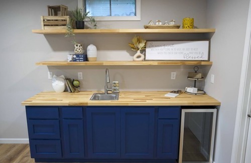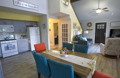 You’ll enter through the keyless entry into the open living space that flows into the fully equipped kitchen. Gather around the solid wood dining table, which seats 6 and enjoy your morning coffee (and lake views) from the coffee bar in the dining space. The wood tones and cozy cottage accents create a sophisticated yet comfortable atmosphere throughout the unit. From the living or dining area sliders, head out onto the large deck, with abundant relaxing seating and festive string lights. Cook and dine in this delightful outdoor space using the patio table and grill provided. You’ll discover yard games off of the lower deck to play in the yard, along with a firepit on the beach with all the s’more fixings included. Back inside, chill out in the comfortable, light-drenched living room with its 58” TV that streams many services including Hulu, Disney, Netflix, and Peacock or feel free to battle it out on the retro Nintendo system.