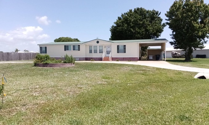 Unique and comfortably prepared 3-bedroom mobile home with space to stretch your legs. The bedrooms feature 1 king bed and 2 queen beds, perfect for a good night's sleep. Amenities include WiFi, A/C, heating, sit in, dine in covered screened porch overlooking the lush yard and waterfront, washing machine, 2 bathrooms come equipped with a bathtub/shower combo, separate garden tub, stand-up shower, all bathroom conveniences including a hair dryer for daily use. 2 separate living areas for entertainment or serenity. Eat in fully equipt kitchen designed for multiple use and sperate dining room. Large yard for outside relaxation. Circular driveway for multiple vehicles and boats. Direct access to the rim canal with boat landing takes 10 minutes. Experience the magic of Lake Okeechobee and nearby recently opened Brighton Bay Casino, 22 minutes away. Everything a fisherman, hunter, or family would have at their finger tips. Come enjoy Florida' s paradise with us.