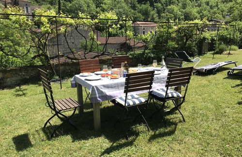 The gîte will comfortably sleep 6 people. Meals "al fresco" can be enjoyed in the courtyard or in the garden. There is also a barbecue. Amenities in the kitchen include a gas hob, electric oven, microwave, fridge-freezer and washing machine. The kitchen is equipped with all you are likely to need to cook the delicious produce you have bought in the local markets. Please note that access to the main house is also via the courtyard but the two properties are some distance apart and the area close to the gîte is screened off and for the exclusive use of guests. Guests also have use of the large garden (shared with the owners) which can be accessed via a number of steps from the courtyard.