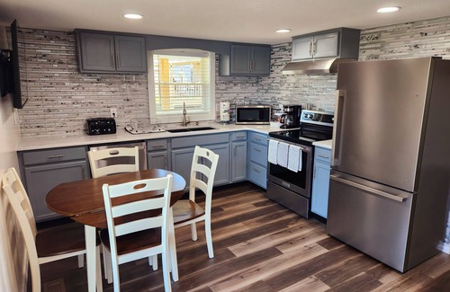 To get to the home, you will go across railroad tracks, we are near the railroad tracks. It is in a small, friendly neighborhood. You can walk to Sandstone General Store and Eatery to get any necessities you may have forgotten for your trip or get a meal.