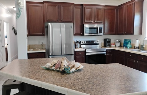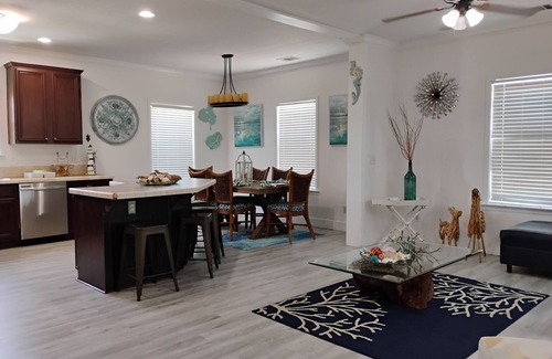 This spacious house in Big Pine Key offers 3 cozy bedrooms - 2 with king beds, 1 with 2 bunk beds with 2 full beds on bottom and with twin beds on top, House has 2 bathrooms. The living room provides an extra sleeping space with a comfy twin sofa bed. House has an open concept very large living room with a large kitchen and dining area, House is 1 mile from boat ramp, and 3 miles from Bahia Honda Beach, house is within walking distance to many restaurants and 2 bars. House is a very large corner home perfect for large families, boat trailers and all your water toys.