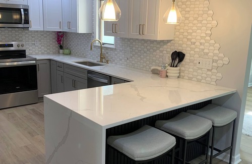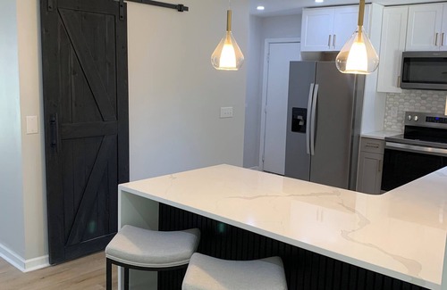 Step into comfort, style, and ease the moment you arrive at our thoughtfully designed three-bedroom, two-bath retreat. Every detail has been chosen with your relaxation in mind, blending high-end finishes with a warm, inviting atmosphere that feels like home—only better. The heart of the home is the fully stocked eat-in kitchen, complete with a spacious peninsula, modern appliances, and every utensil you could possibly need. Start your mornings at the full coffee bar, with everything from a fresh brew to specialty drinks at your fingertips, and gather around the elegant dining room table that comfortably seats eight for shared meals and lively conversation. Each of the three bedrooms is a serene sanctuary featuring plush, high-end bedding, a 55-inch smart TV, a dresser, and a full ironing board with iron for added convenience. The primary suite offers its own private ensuite bathroom and chic design, creating the perfect oasis to unwind after a long day. From streaming your favorite shows on sleek TVs to tackling laundry with the in-home washer and dryer, you’ll find everything you need to feel cared for, and the thoughtful layout is designed with both style and coziness in mind, making it just as inviting for families as it is for small groups of friends. A private four-car driveway ensures you’ll never have to worry about parking, making arrival and departure seamless from start to finish. Whether you’re gathering with family, celebrating a special occasion, or simply craving a luxurious escape, this home is the perfect backdrop for unforgettable memories.